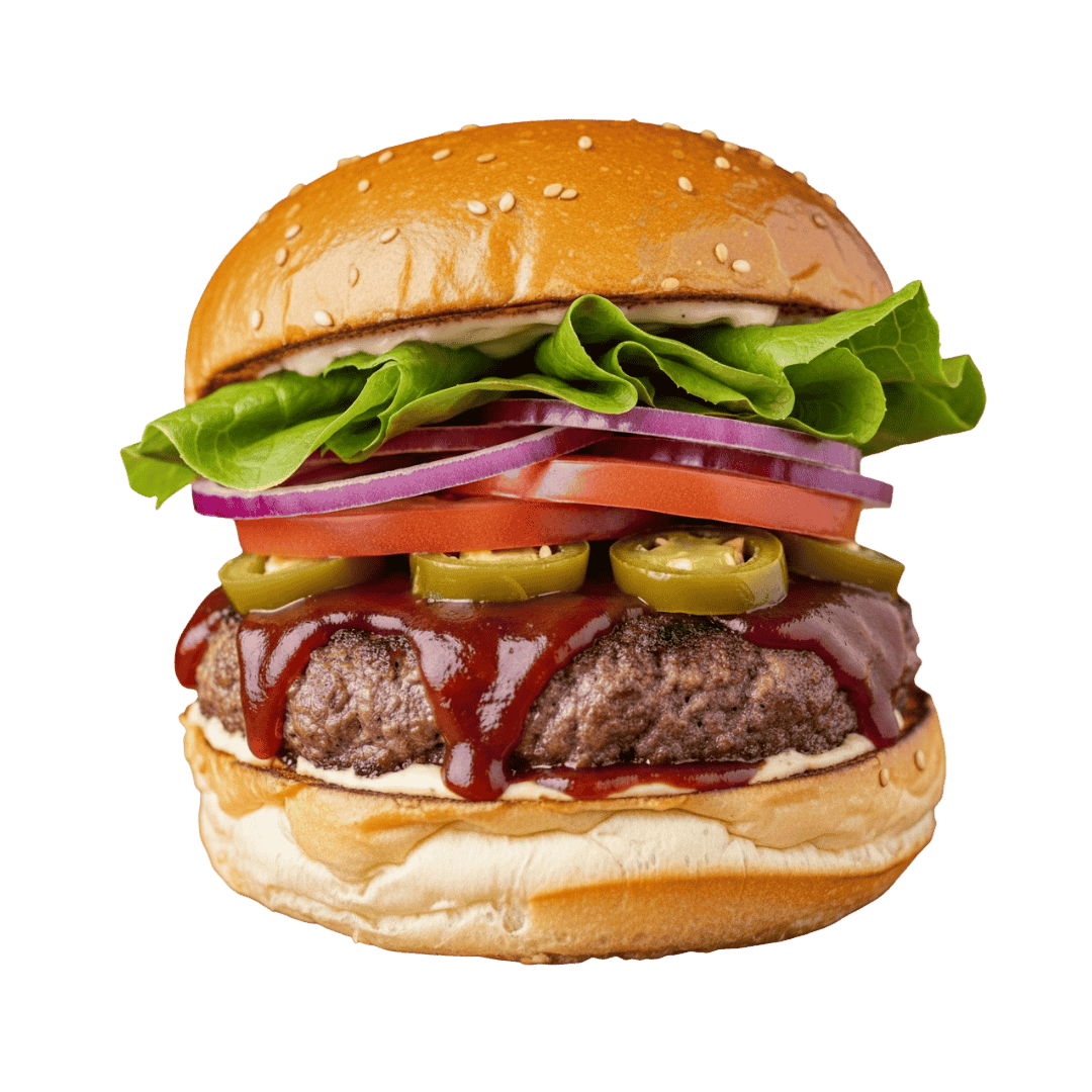 Big, bold, and smoky with a spicy twist. A gourmet beef patty flame-grilled to perfection, layered with tangy BBQ sauce, fiery jalapeños, and crisp fresh veggies, all stacked inside a soft, fluffy brioche bun. A burger that packs heat and flavour in every bite.